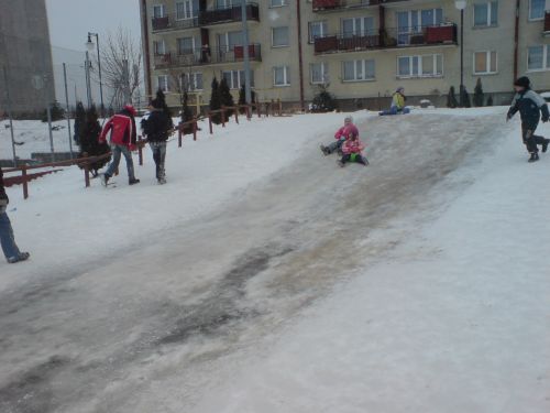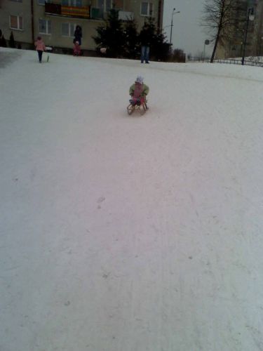 Na pierwszej fotce Asia na jabłuszku, na drugiej Julka na szczycie, potem Julia na jabłuszku, i dwie fotki z Asią na sankach, no i Julka i Asia, która chciała wskoczyć koniecznie do kaczuszek