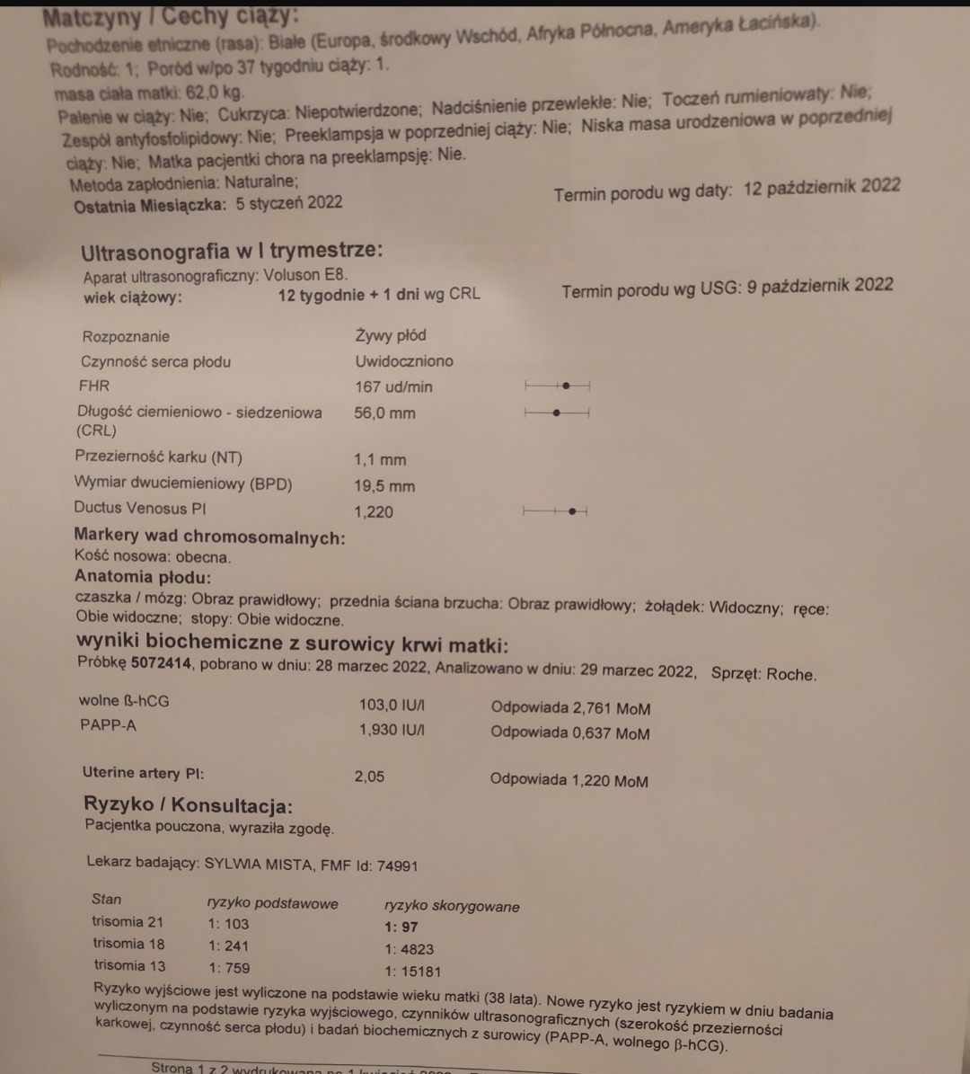 33 lata. Zwykle usg bez zarzutu wszytsko super. Na prenatalnych nt 2.1 ale już nieprawidlowy obraz serca plus dysproporcja glowy - poszerzona. Już raz poronilam w 6 tc.Nie martw się na zapas ,,ja to ostatnio prxewbialam ,ile masz lat? Jak wyszło Ci USG ???
