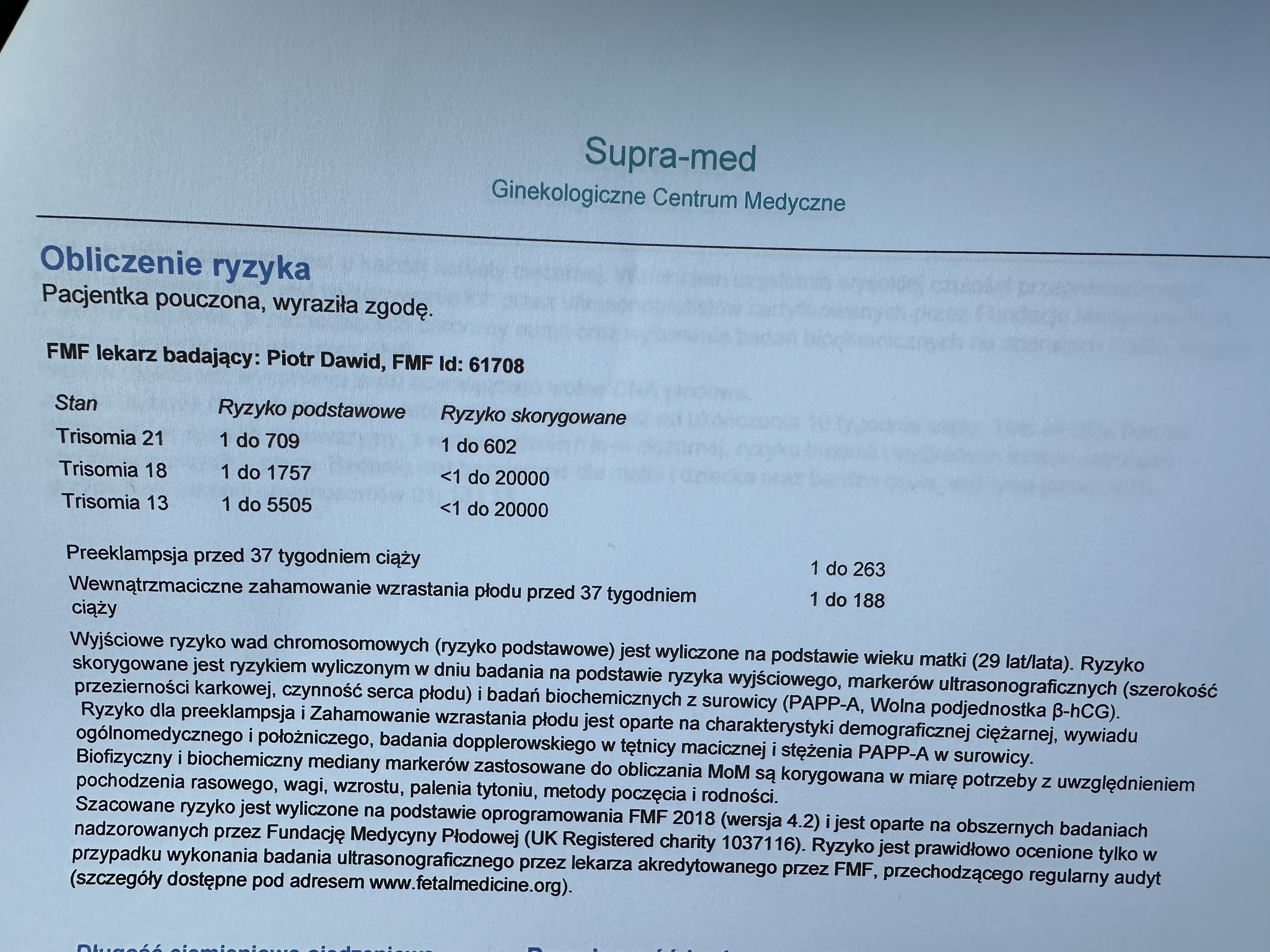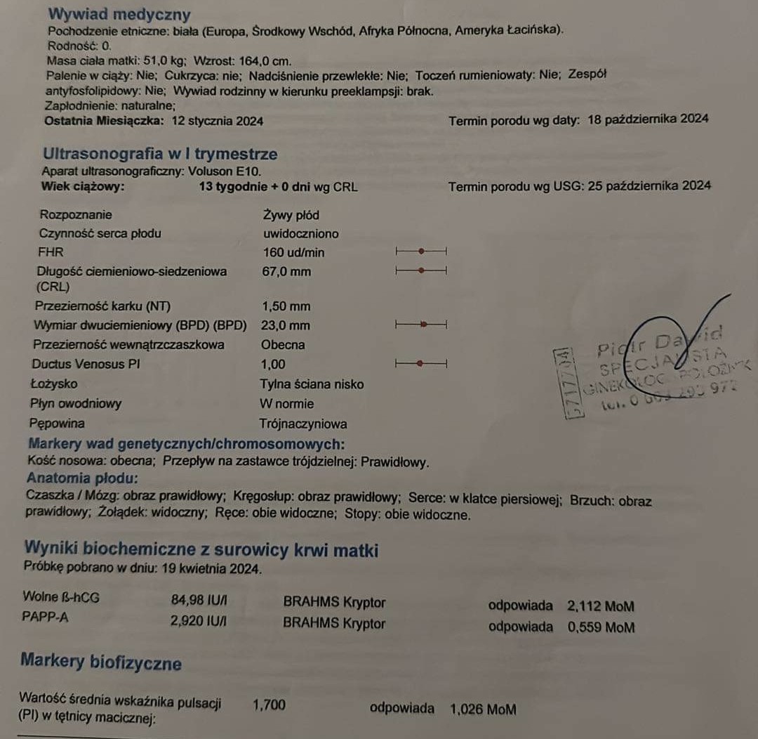Cześć. Jestem po I prenatalnych, które były robione w 13 tc. Z USG wyszło wszystko dobrze. Niestety wynik PAPPA wskazał pośrednie ryzyko trisomi 21. Niestety lekarz, który wykonywał prenatalne(inny niż mój prowadzący) dopiero po majówce bedzie dostępny żeby objaśnić mi wynik a ja do tego czasu chyba zwariuję…