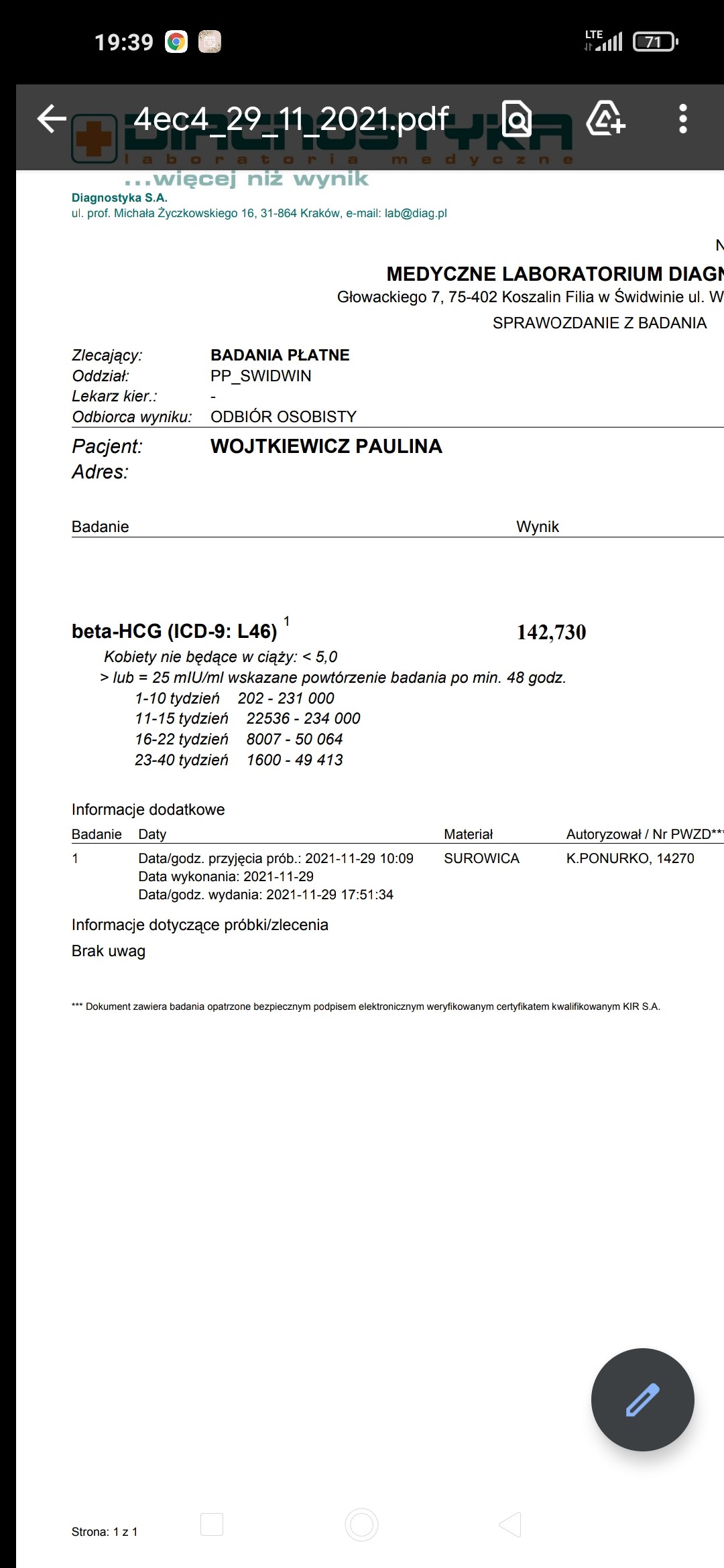 Wynik jest pozytywny więc ciążaHej odebrałam wynik i nie wiem jak mam to rozumieć ? Jest ciąża ? Bo na wykresie tego nie widać , okresu brak , są osłabienia czasami, pomocy.