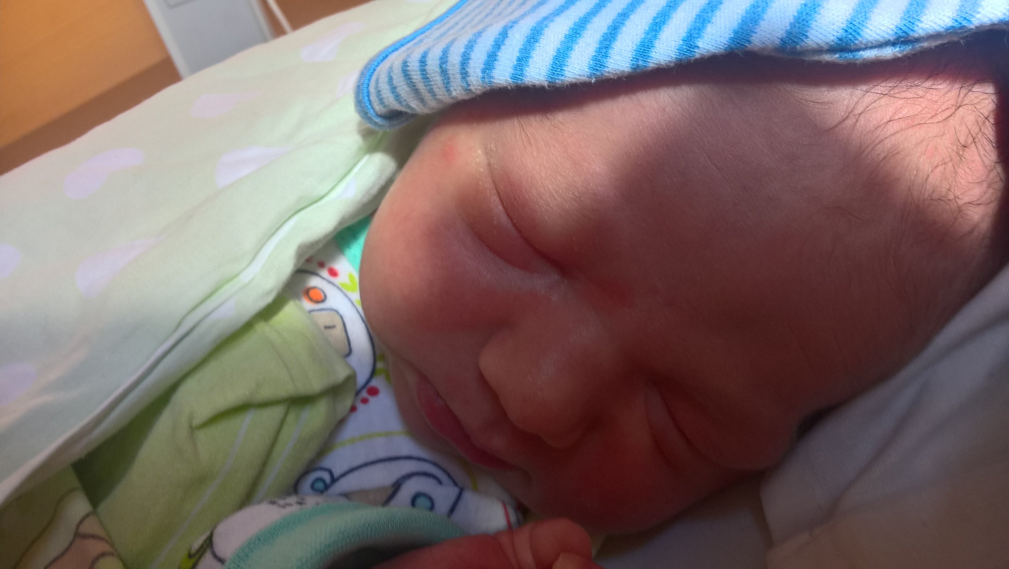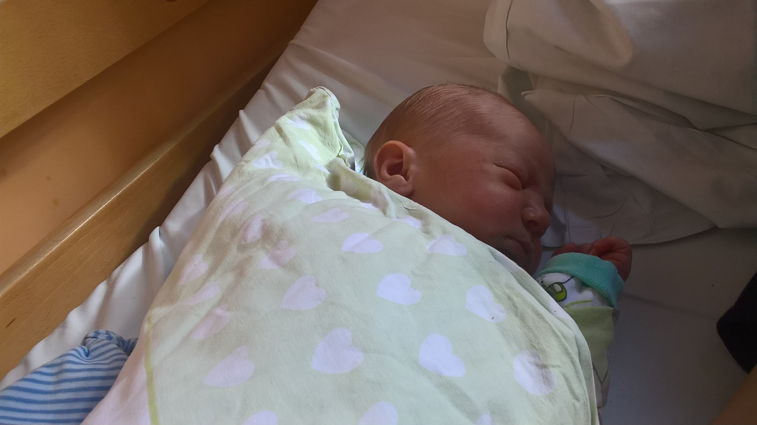 hej Dziewuszki. Dziekuje za tyle slow wsparcia. No i załączam zdj mojego małego urwisa ;) na razie, " odpukać " jest grzeczniutki, duzo śpi, malo płacze ;) lubi tylko byc bliziutko mamy, wiec leży cały czas ze mna ;) ciekawe kiedy sie rozkręci i będzie ryczal. Ja sie czuje kiepsko, wszsytko boli po tej cesarce, ledwo laze. No, ale dzis bylam na sali odwiedzin, umyłam sie, no i trzeba robić przy Małym. Leze w dwójeczce, wiec jest komfortowo dosyc. Karmimy MM ;)