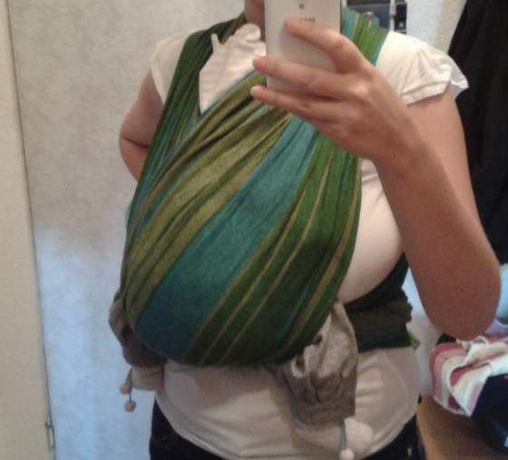 No tak, nóżki są faktycznie szerzej niż w kieszonce np. Tylko jak byłam na warsztatach fizjo mówiła, że można takie maluchy nosić, ale założyć na główkę chustę, mnie się sama założyła. Tak czy siak wrócę do tego wiązania za jakiś czas, jak mała podrośnie, z uwagi na to, że się tak właśnie utopiła. A i łatwiej mi będzie dociągnąć jak jeszcze mi chusta zmięknie.