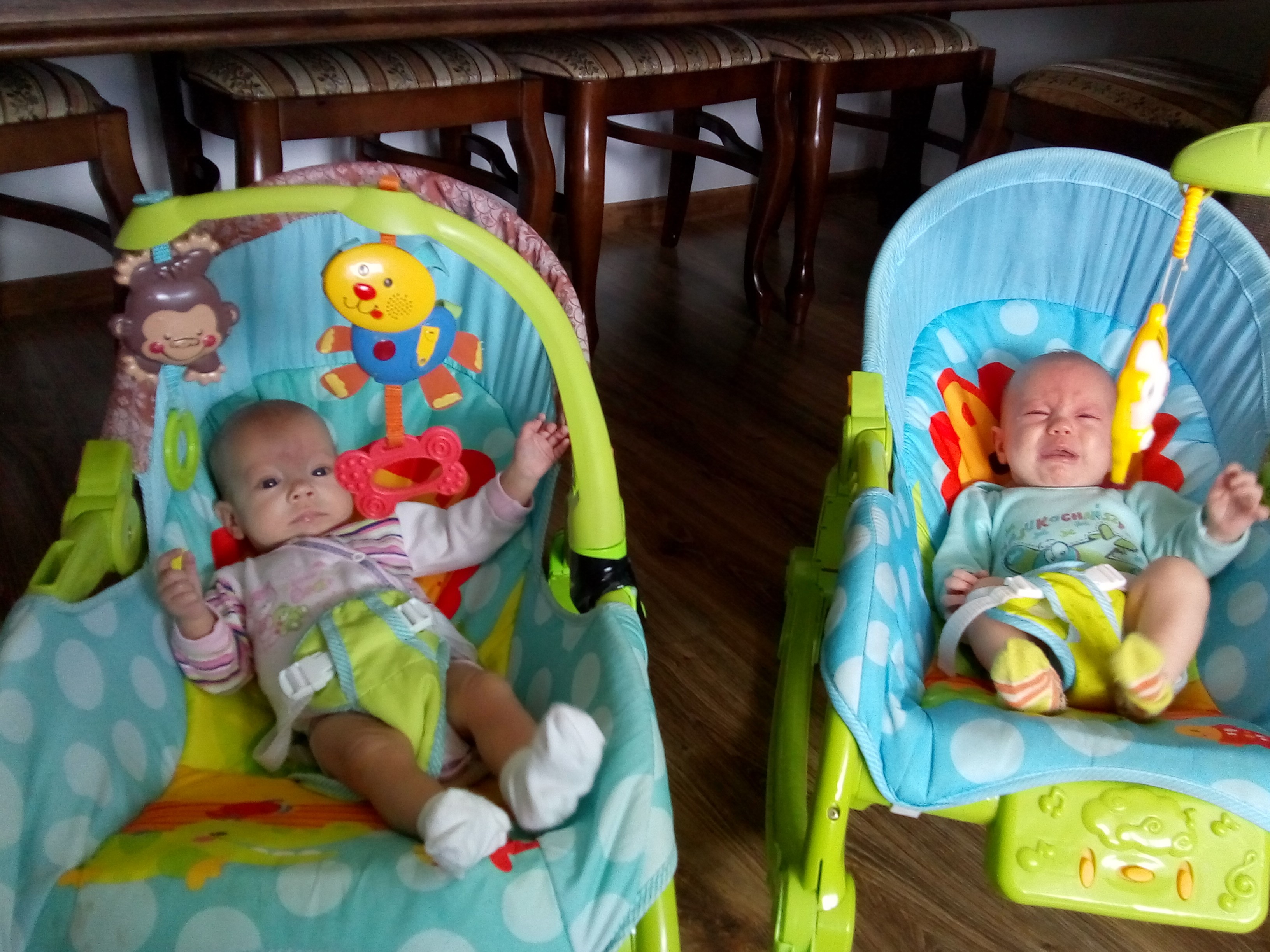 A czemu Adaś płacze?Chlopaki sa ogolnie slabi ruchowo, wszystkie etapy osiagaja pozniej niz większość dzieci. Cwiczymy i czekamy. Michal zawziecie pelza i zaczyna raczkowac, Bartus jeszcze za slaby, troche sie turla, ale miewa dni ze lezy plackiem i nie ma sily sie ruszyc, albo mu sie nie chce, bo jest dość leniwyZdecydowanie za szybko rosną