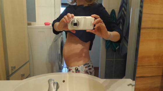 Tak na żywo brzuszek jest chyba jeszcze większy trochę się boję, jak to będzie dalej. Piorę właśnie ubrania ciążowe, bo już w żadne spodnie się nie mieszczę, choć ogólnie waga na minusie- tyle dobrego