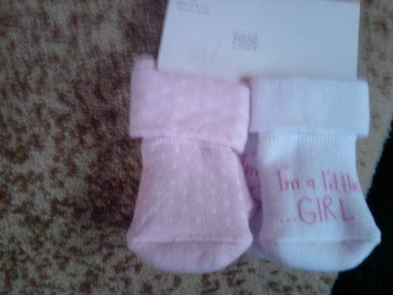 własnie moja mamcia wrociła z miasta. Kupiła dla naszej dzidzi śliczne skarpeteczki z krówkę która wesoło grzechocze,smoczek,buteleczke antykolkową z lovi,pieluszki tetrowe w misie, słodką mała zieloną czapeczke i termometr