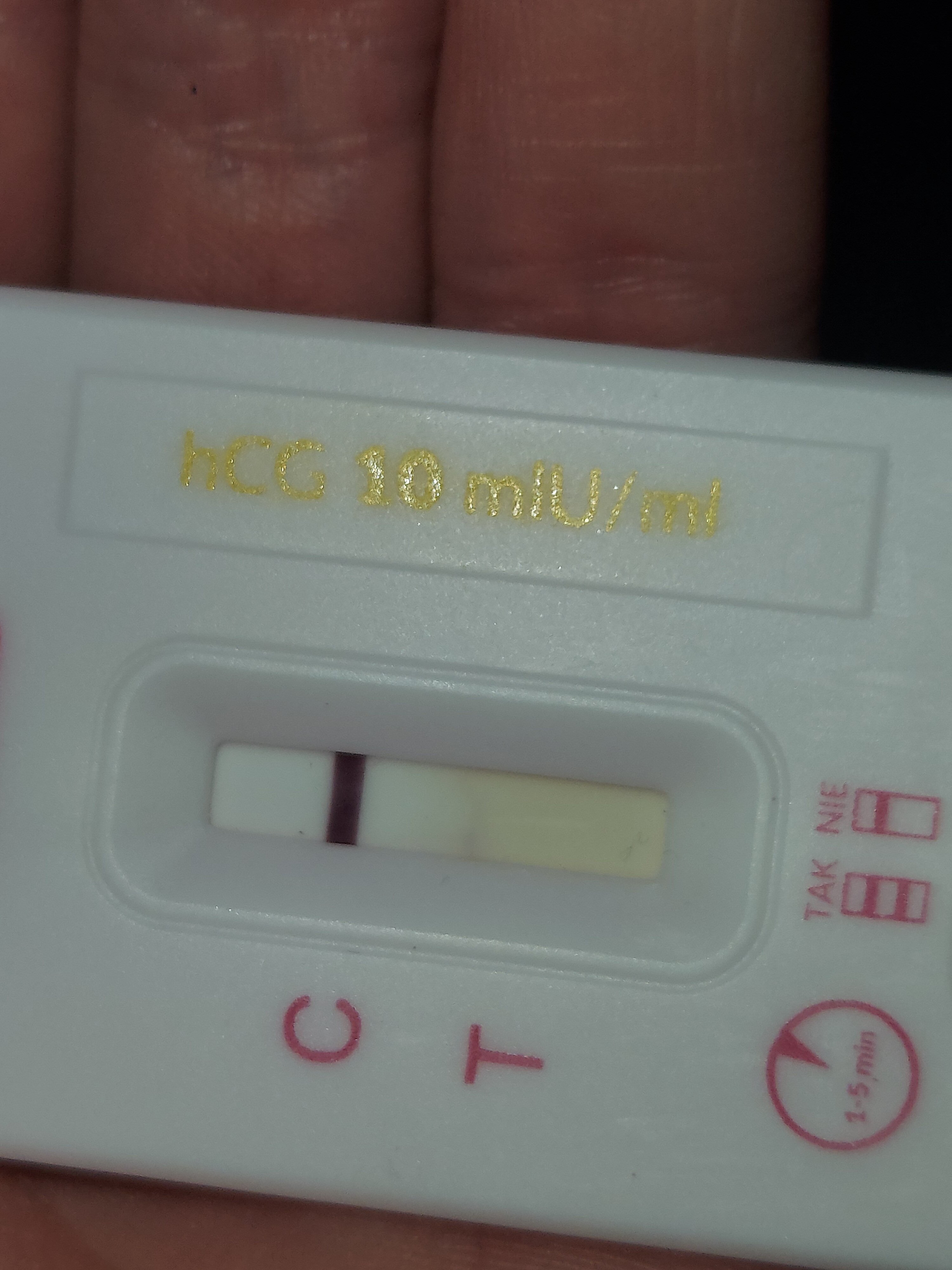 Ten wygląda na zalany niestety, coś jest z nim nie tak. Coś niby widać, ale trudno powiedzieć, czy ciąża jest, czy test wadliwy. Zrób rano z pierwszego moczu test.