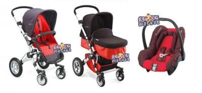 . w opakowaniu znajdują się następujące elementy: stelaż z koszykiem, siedzisko spacerowe z okryciem na nóżki i budką, gondola, folia przeciwdeszczowa na spacerówkę, osobna folia na gondolę