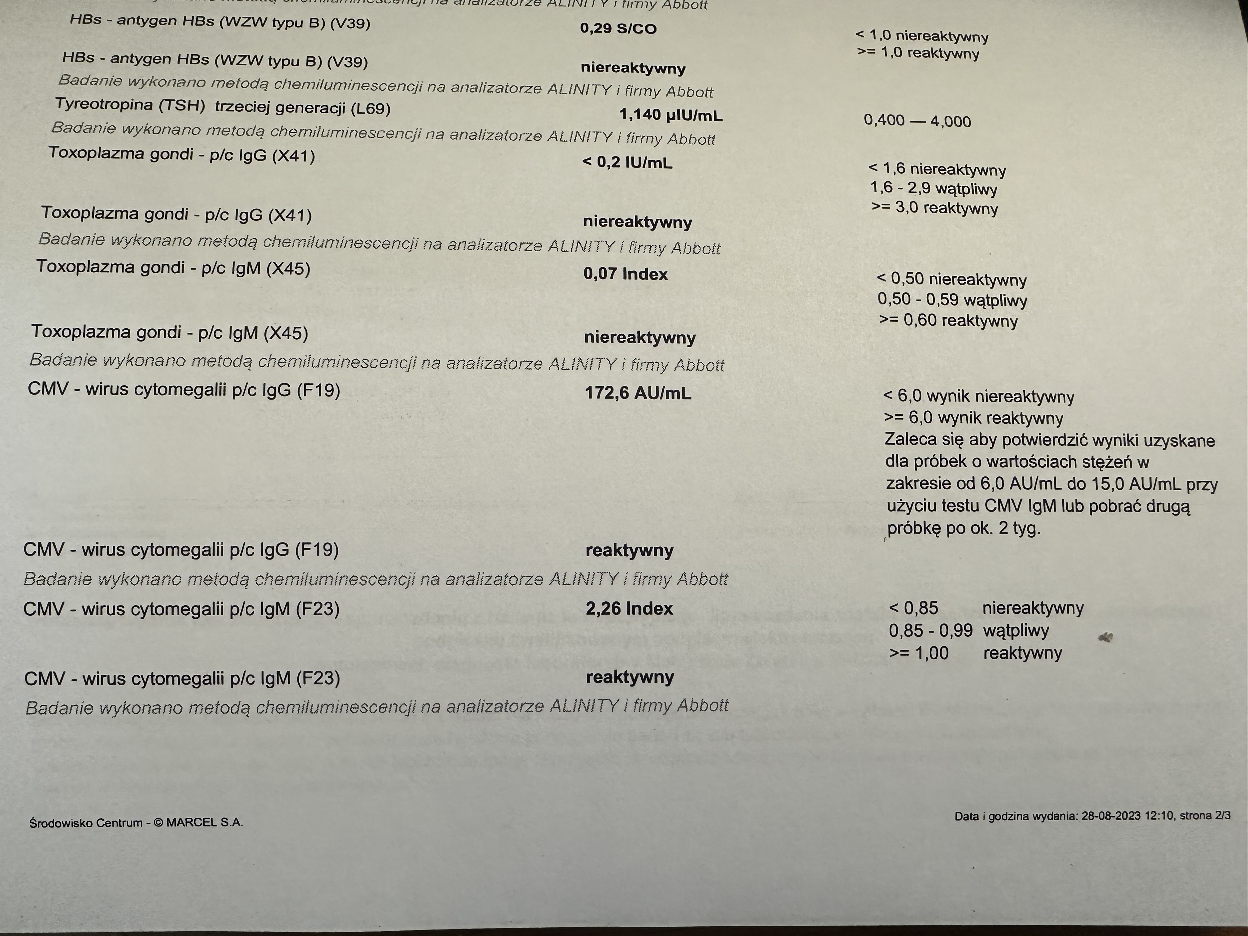 Cześć, byłam na badaniach krwi. Ogólnie wyszło wszystko dobrze, jednak CMV cytomegalia nie podoba mi się. Załączam zdjęcie. IgG 172,6 (reaktywny) IgM 2,26 (reaktywny). Jestem w 6 tygodniu ciąży. Czy to oznacza ze przeszłam wcześniej cytomegalie czy ze właśnie teraz przechodzę? Wizyta u lekarza dopiero za tydzień