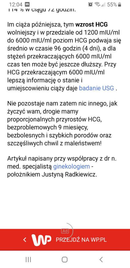 Oby bo juz sie stresujeW prawidłowej ciąży poziom HCG wzrasta przynajmniej o 66 % w ciągu 48 godzin i o 114 % w ciągu 72 godzin. Im ciąża starsza tym wzrost stężenia HCG wolniejszy i w przedziale 1200 mIU/ml-6000 mIU/ml poziom HCG podwaja się średnio w czasie 96 godzin (4 dni), a dla stężeń przekraczających 6000 mIU/ml ten czas może być jeszcze dłuższy. Przy HCG przekraczającym 6000 mIU/ml lepszą informację o stanie i umiejscowieniu ciąży daje USG.