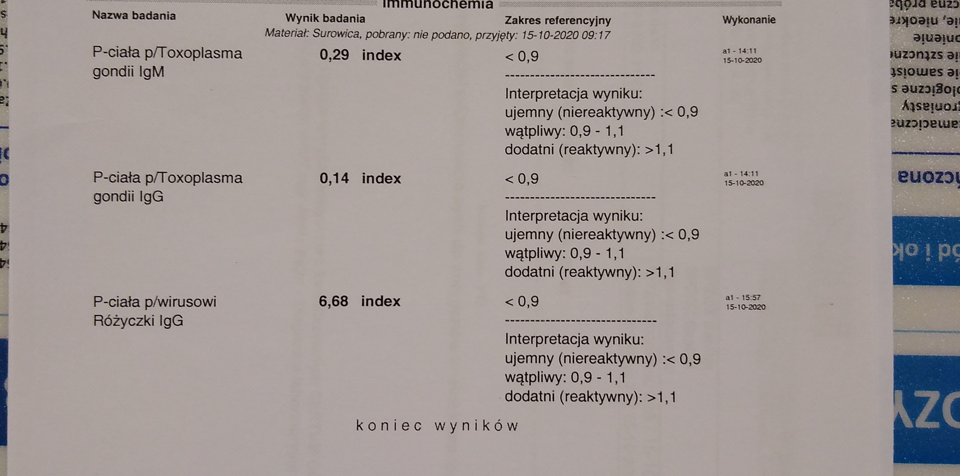 Jak dla mnie- toksoplazmozy nie przechodziłaś, nie masz tez na szczęście świeżego zakażenia. Masz przeciwciala przeciwko rozyczce , albo przechodziłaś albo po szczepieniu. Wyniki są okDziewczyny pomóżcie mi zinterpretować te wyniki proszę.... Jest ok? Zobacz załącznik 1195756