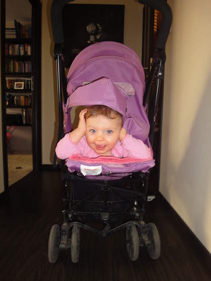 , gada po swojemu jakieś piski głównie, pozycję do raczkowania opanowała, ale do przodu porusza się w dość specyficzny sposób nawet nie wiem jak to opisać