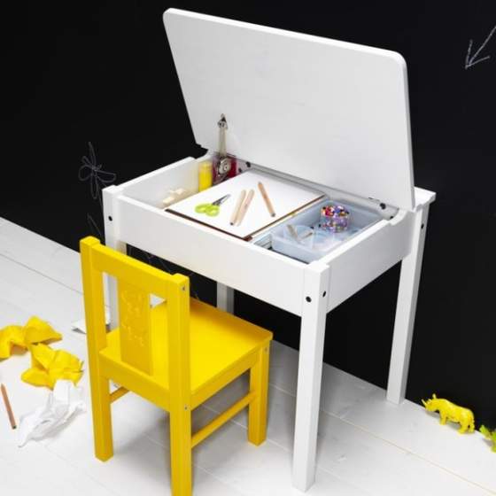 No i kupiła stolik/biurko SUNDVIK z otwieranym blatem wraz z krzesełkiem - wszystko białe (są też szarobrązowe). Genialna przechowalniana kredek, kartek itp.