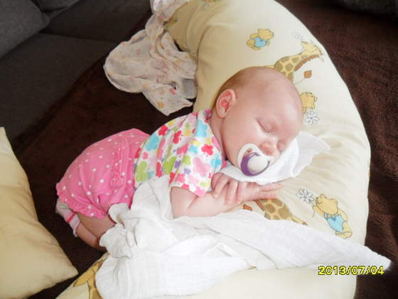 bo najbradziej lubi byc na ramieniu jak do odbicia noszona i tak zasnie więc jak w tej pozycji ją położe na rogala t dalej tak na nim śpi jedną drzemke w ciągu dnia sobie tak strzeli na brzuszku a i tak poleżeć na nim lubi i nawet wtedy nie płacze najszybciej się denerwuje kiedy lezy płasko na pleckach jakoś nie lubi tak leżeć