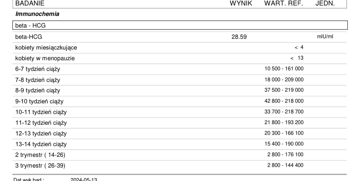 Pojedynczy wynik mówi tylko, że poziom hormonu wskazuje na ciążę (przypuszczalny wiek ciąży wg legendy). To czy ciąża się rozwija powie lekarz lub kolejne badanie hormonu (w tym samym laboratorium, po 48h od ostatniego badania, lub po 72h). Ważny jest przyrost hormonu.