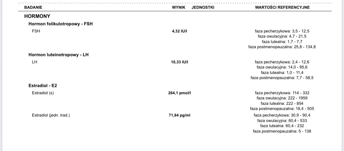 Biorę dostinex, ale badanie zostało wykonane kiedy go obstawiałam na 2 miesiąceCzemu robiłaś badania przed miesiączką? LH, FSH, estradiol i prolaktynę zazwyczaj wykonuje się w 3-5 dniu cyklu, a nie przed miesiączką.