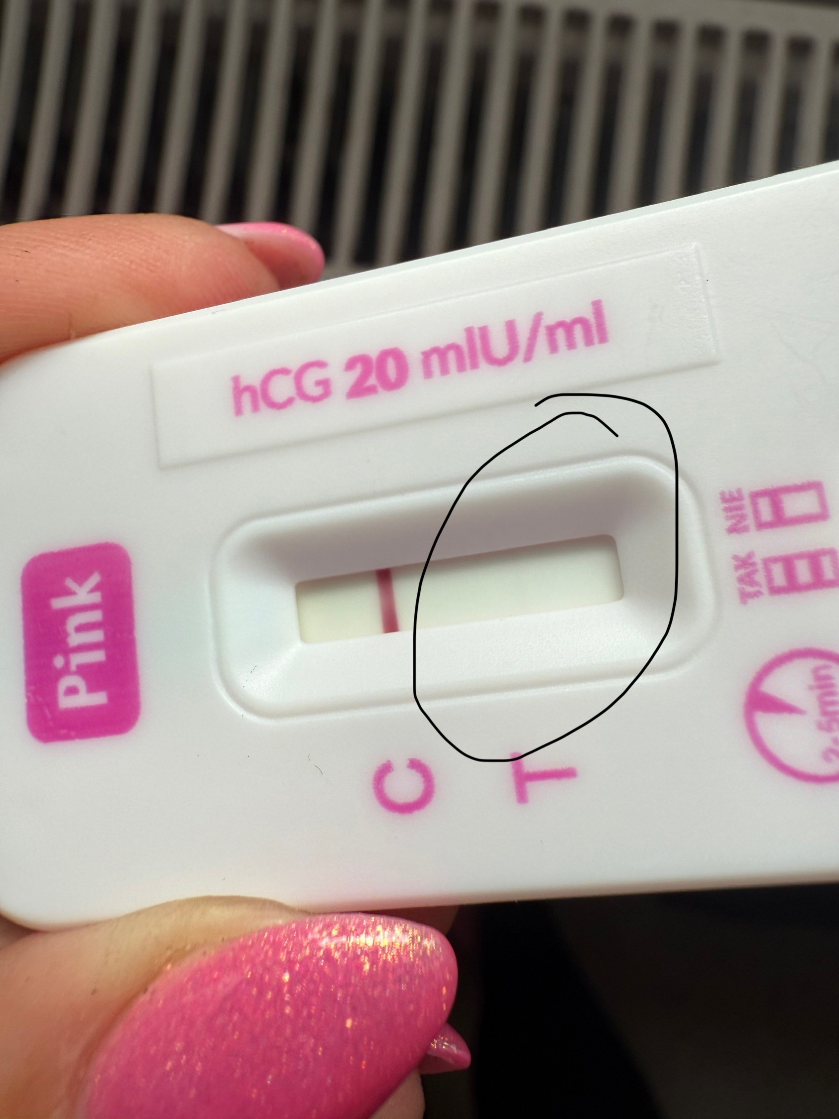 Niby coś widać nieby nie .Hejka. Dziewczyny w was sila. Czy ten test oznacza ciaze ? Okres spoznia sie tydzien. Wynik odczytany 5 minut po zrobieniu testu. Kreska jest ale slabo widoczna ze musze sie przyjzec zeby ja zobaczyc
