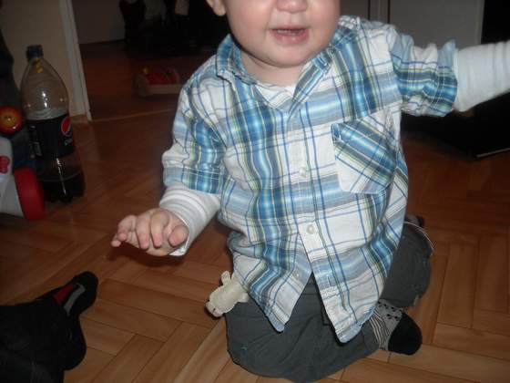 To co mi się udalo uwiecznic to na pierwszym zdjęciu wstawanie właśnie podpierając sie na kolanku z rączkami wyciągnietymi do góry. Wstaje podskakujac kilka razy na pupce aż uda mu się podniesc na równe nogi. Czasem go asekurujemy, czasem wyladuje na rączkach, a czasem uda mu sie wstac.