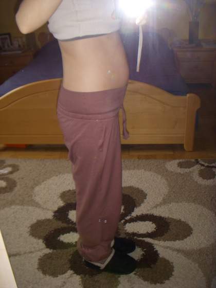 Jedno zdjęcie w ciążówkach z c&a, ale jeszcze troszkę za luźne w pasie. Aby patrzeć i będą pasować.