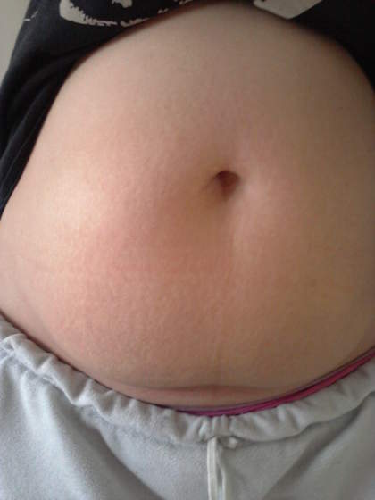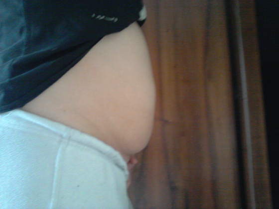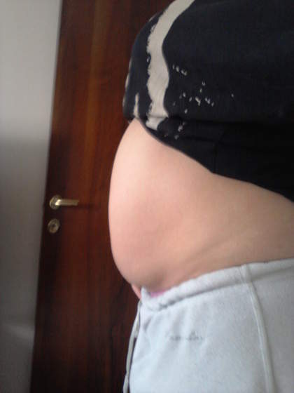ja po pierwszej ciazy mialam bardzo obwisly brzuch i przez zerwane miesnie niemoglam go splaszczyc i teraz jest taki duzy ale spod spodu widac ze wisi troche "troche duzzo"