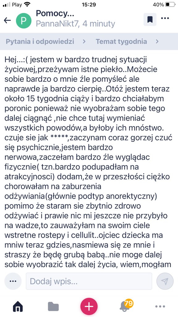 Oj to trochę wyglada na to (jeśli to nie prowokacja) że dziewczyna potrzebuje iść do specjalisty, nadal widać ma psychiczny problem jeśli chodzi o wygląd... Niestety, ja tez miałam bulimię i epizod anorektyczny, wyleczyłam się z tego, ale wyobrażam sobie jaki dziewczyna może mieć w głowie teraz koszmar w związku ze zmieniającym się ciałem, to co ona pisze nie jest zdrowe i normalne, zaleciła bym natychmiastową konsultację z psychiatrą, aborcja tu może być wskazana. Ja wiem jak. Iektore kobiety może to wkurwić, bo one się tyle starają a tu taki kwiatek, ale nie możemy tak na to patrzeć, każdy jest indywidualnym bytem i nie może y innym kazać robić czegoś bo my nie może h tego zrobić. Jak to się mówi, gdzie diabeł nie może tam babę pośle... Tak nie może być, dziewczyna potrzebuje ewidentne wsparcia i pomocy w ustaleniu priorytetow. Oczywiście jeśli to nie jest prowokacjaTo ta panienka tutaj ....