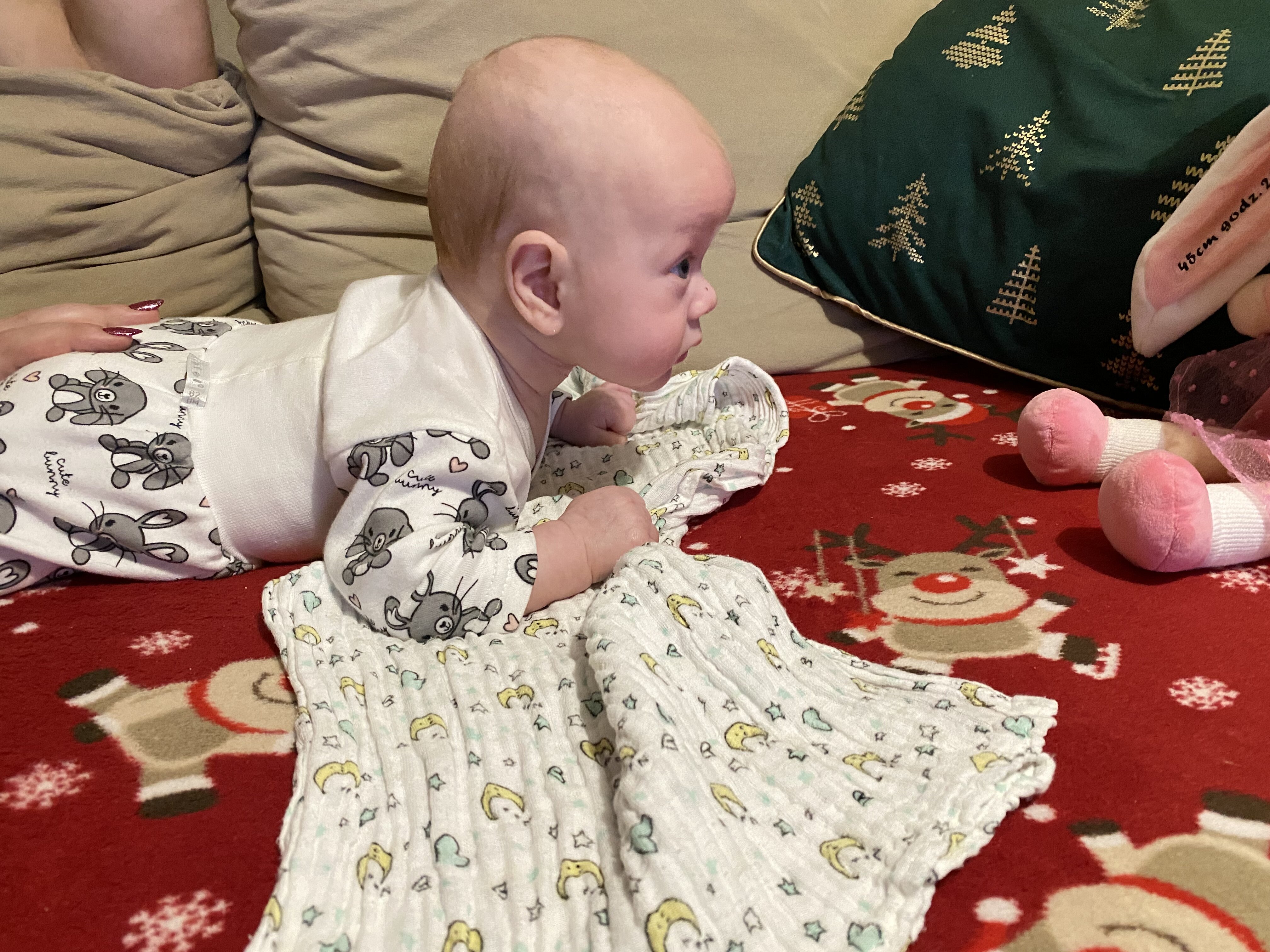 My dziś kończymy 3 miesiące. Nie jest źle, wiele rzeczy się poukładało. Mamy coraz dłuższe okresy czuwania i ogólnie okresy pogodnego nastroju nam się wydłużyły. Mamy dalej problem ze zrobieniem kupy bo wstrzymuje i mocno go boli brzuszek... wtedy jest płaczliwy - także na piersi. Dostaliśmy debridat na receptę, czekamy na efekty... Ale gdyby nie to, i gdyby nie fakt że nie lubi zasypiać i spać to Noliś jest bardzo fajnym, małym uśmiechniętym dżentelmenem