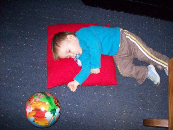 , ale zaś w dzień mi dużo śpi. Chciałam go kłaść tylko raz spać w dzień, ale niestety to nie możliwe bo jak go nie położyłam ostatnio spać w dzień raz to postanowił się zdżemnąć na podłodzę (fotkę wkleję poniżej)