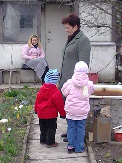 2. Babcia z wnukami na działce