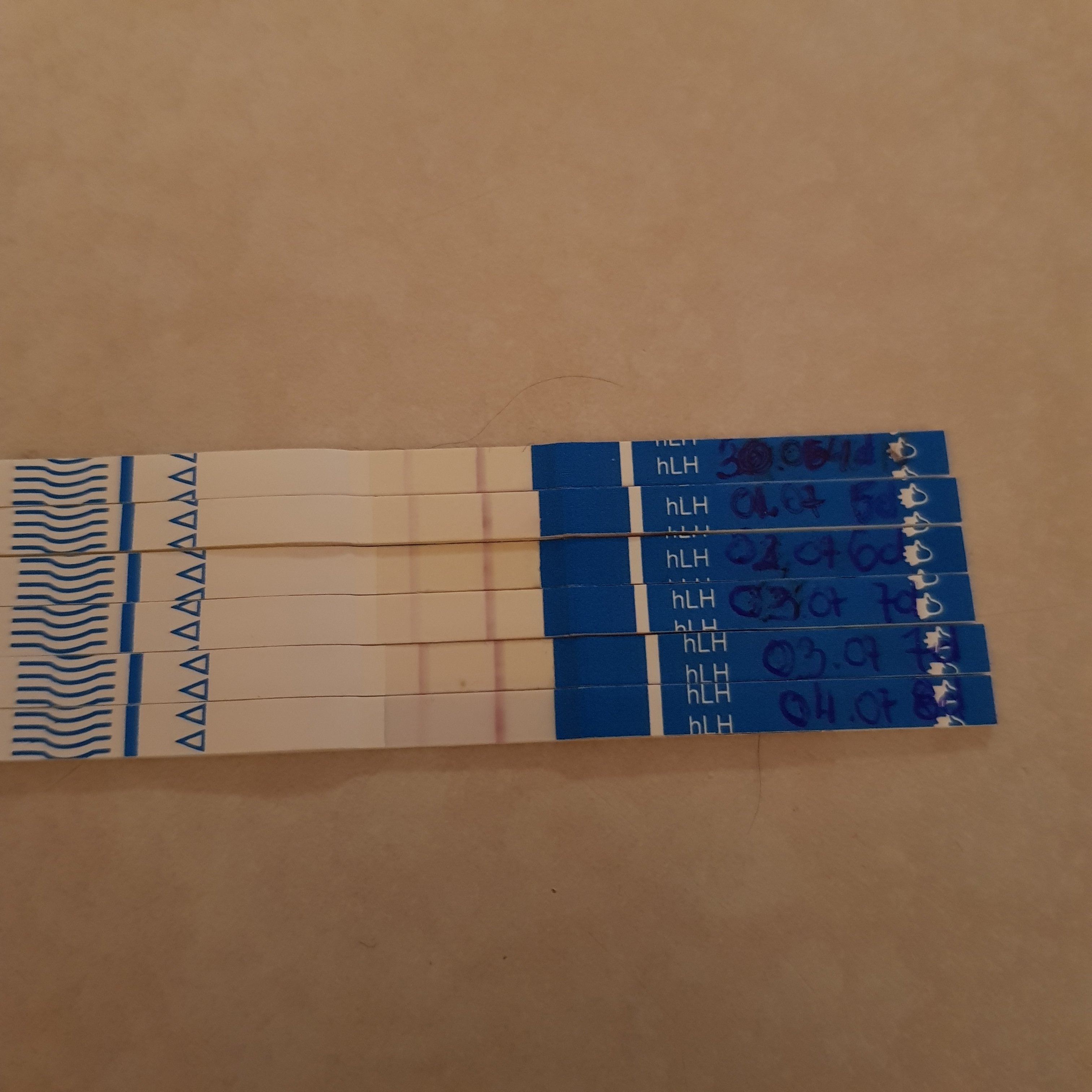 Bardzo proszę Was o pomoc w interpretacji testów owulacyjnych. Ostatni okres trwał 2 dni w zwiazku z tym pomyślałam, że owulacja może być szybciej. Testy zaczęłam 4 dnia cyklu. Klucie jajników i bol piersi nie ustawaly, a 5 dnia cyklu zaczął się sluz plodny, ostatni test jest dzisiejszy z godziny 20. Wczoraj testowałam 2x drugi z wieczornego moczu. Będę wdzięczna za pomoc.