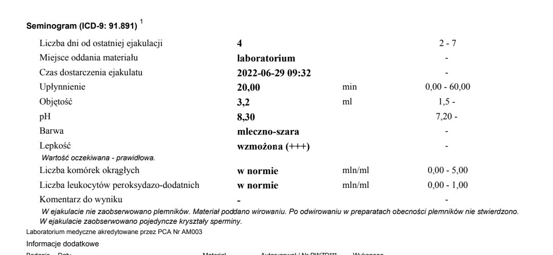 Czy to pierwsze badanie męża tego typu? Leczycie się w klinice leczenie niepłodności? Czy jesteście w trakcie procedury in vitro? Ten wynik z pewnością wymaga konsultacji lekarskiej i, jak sądzę, dalszej diagnostyki. Natomiast odpowiadając na pytanie czy jest szansa na dziecko - tak, jest. Po pierwsze sądzę, że badanie będzie wymagało powtórki za jakiś czas. Mi Pani Doktor mówiła, że parametry nasienia mężczyzn zmieniają się jak sinusoida. Miała pacjenta, który miał niewiele plemników w ejakulacie, ale były. Przy punkcji, gdy pobrano mu materiał - nie było żadnych i szlak trafił stymulację. Także możliwe, że wynik który widzisz jest tymczasowy. Nawet jeśli się poprawi to nie sądzę, żeby to była jakaś kapitalna poprawa, która umożliwiałaby zajście w ciążę naturalnie (mam nadzieję, że się mylę - zdaje sobie sprawę, że wystarczy jedna komórka i jeden plemnik, ale prawdopodobieństwo po prostu nikłe) . Natomiast, jeśli podchodzicie czy rozpatrujecie in vitro to jest wiele metod selekcji plemników, żeby wyłapać te najsilniejsze (nawet jeśli parametry nasienia są słabe), a w przypadku braku nasienia w ejakulacie - robi się biopsje jądra i tam szuka żołnierzy. Mam koleżankę, która miała taka sytuacja i ma obecnie 3 letniego Synka dzięki in vitro. Skonsultujcie się z lekarzem, który zlecił badania.