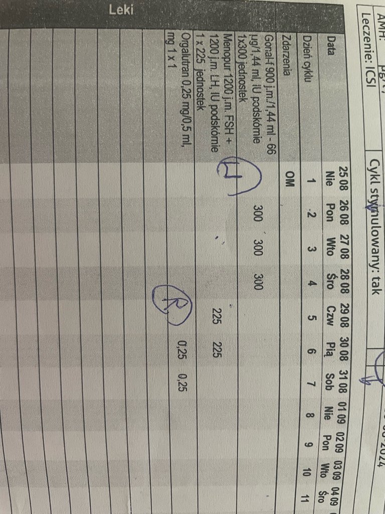 gonal i menopur wieczorem, orgalutran rano, wizytę kontrolną w sobotę i wtedy tez zrobią mi hormony, punkcja poniedziałek- środa.Ja miałam hormony badane jakoś 7 i 9 dnia stymulacji. Nie miałam badanych w dniu punkcji bo wiedzieliśmy że transfer odroczony.