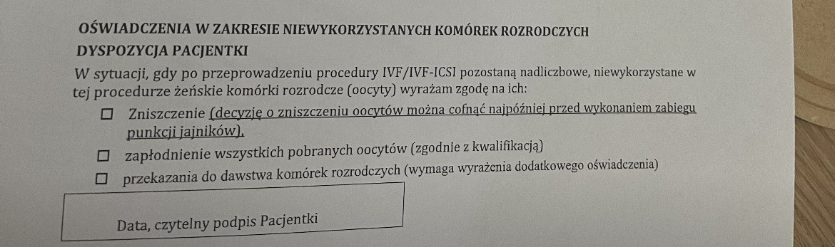 U mnie w klinice jest taki zapis jak w załączniku. Wydaje mi się że można też zamrozić komórki same, ale ich odmrażanie, zapładnianie i potem zamrażanie ma małą niestety skuteczność i w większości przypadków nie jest rekomendowane (oczywiście do konsultacji z lekarzem). Plus w programie rządowym ta kwestia nie jest oficjalnie rozpisana - więc też już w Twojej klinice zależy jak oni do tego podejdą, czy się zgodzą na taką opcję i czy będzie można te komórki potem zapłodnić w programie czy też już tylko komercyjnie.Ok, dzięki za info. Właśnie zastanawiałam się też czy można zostawić np w celu zapłodnienia nich za jakies 2 lata jak bym chciała wrócić po jeszcze jedno dziecko. Moje AMH pewnie będzie wtedy jeszcze gorsze niż teraz.
