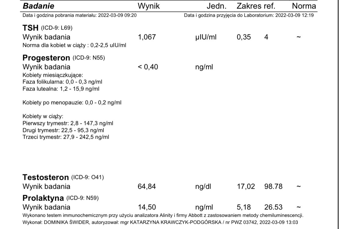 No właśnie nie wiem.. bo plamie :// mam podejrzenie PCOS a testy owulacyjne ( tak jak wyżej napisała koleżanka) wychodziły pozytywne :// nie wiem sama co o tym myślećTSH ok. Prugesteron wskazuje na brak owulacji. Pytanie czy zrobiłaś go w odpowiednim czasie (7-8dpo)? Z tego co kojarzę testosteron w górnej granicy. Prolaktyna w normie, chociaż spotkałam się z opinią, że przy staraniach optymalnie 10.