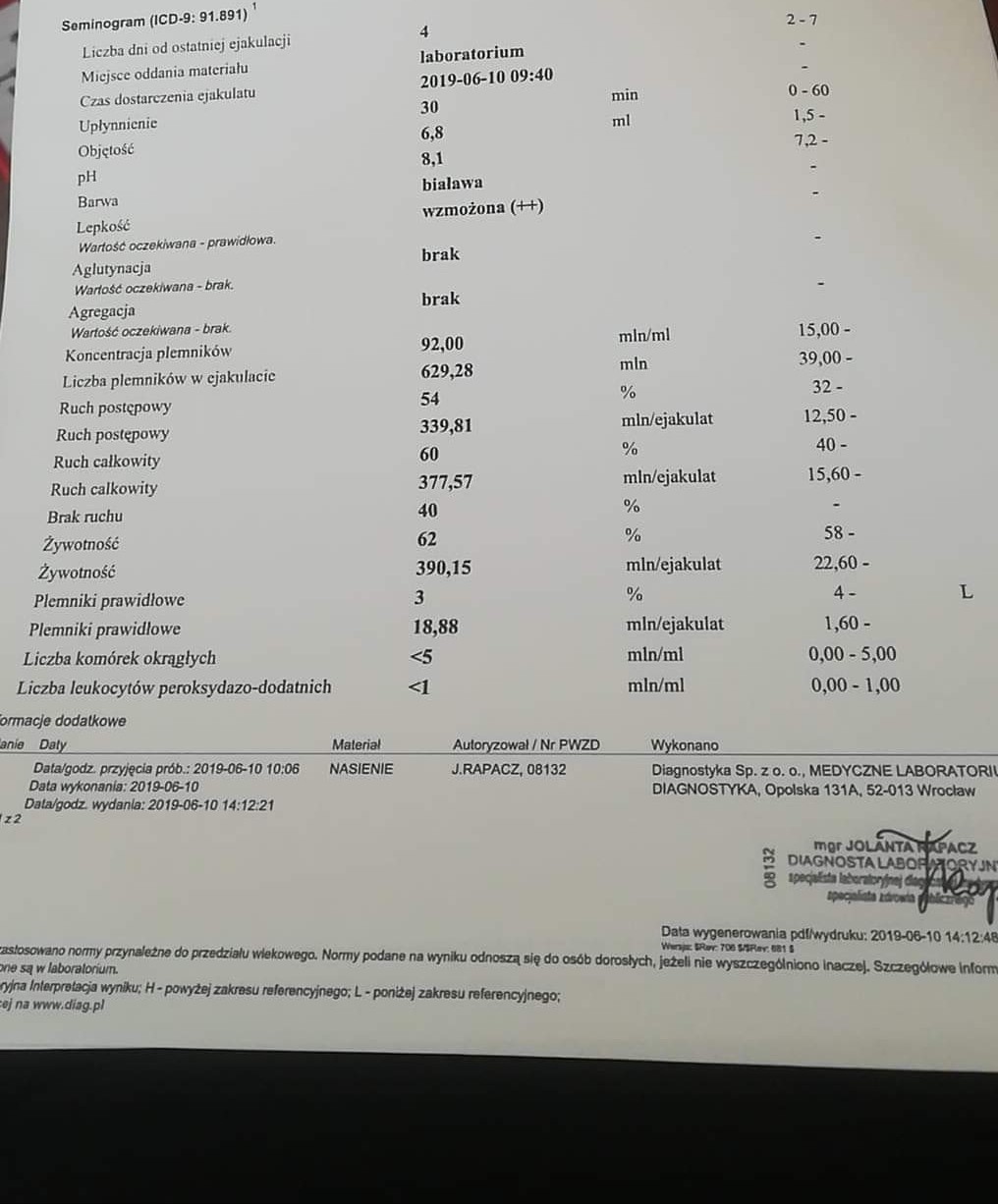 Ogólnie wyniki bardzo dobre jedyne ph i lepkości może świadczyć o stanie zapalnym np najlepiej skonsultować wyniki z andrologiem urologiem warto zrobic jeszcze usg ogólnie nie ma sie czym martwić. Jesli długo aie staracie ty zdrowa mąż/partner takie wyniki warto zrobić przeciwciała przeciw plemnikowe w spermieWitam, proszę o interpretację wyników nasienia, wizyta dopiero za tydzień u gina. W załączniku zdjęcie badań