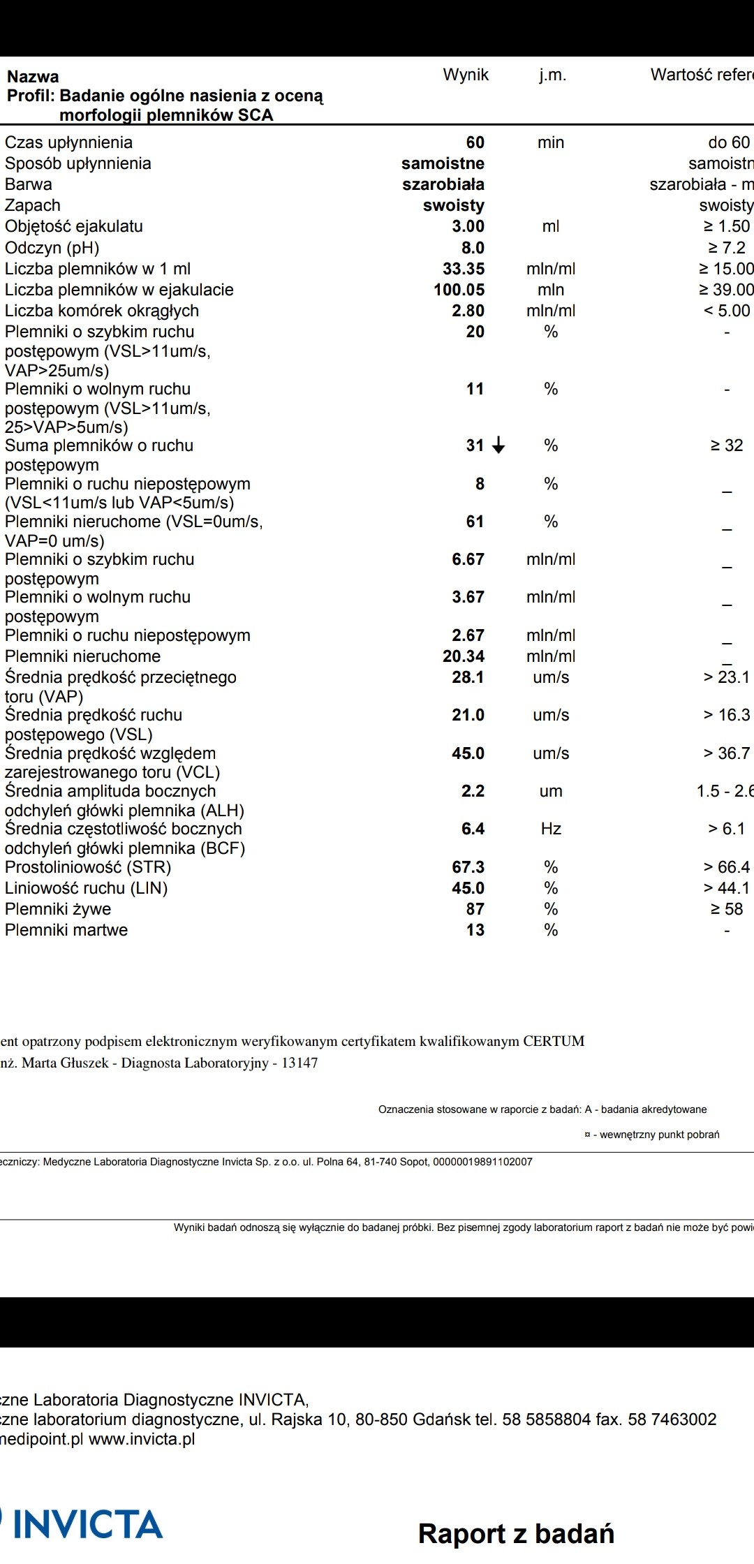 Nie ma.Albo mam coś z oczami albo źle patrzę - czy na wyniku jest % plemników o prawidłowej budowie?