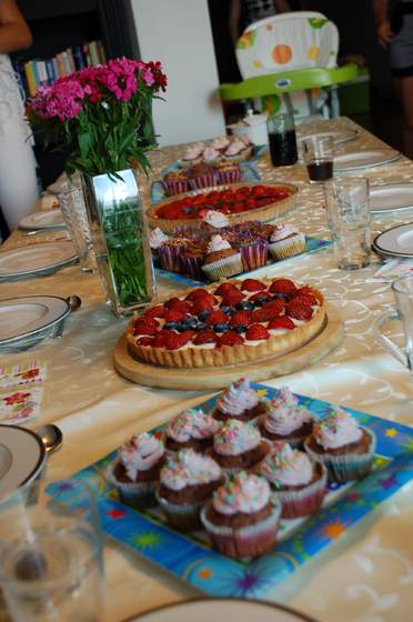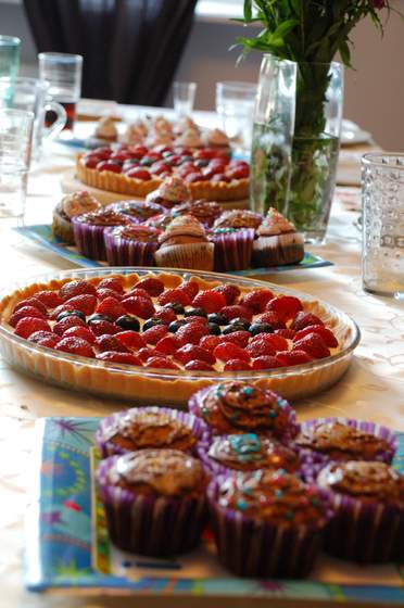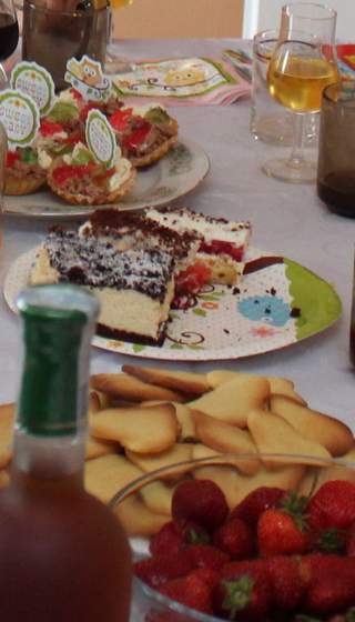 ), ciasta z sowy, kruche ciasteczka w krztałcie serduszej (ja), babeczki z galaretka i kremem. Owoce.