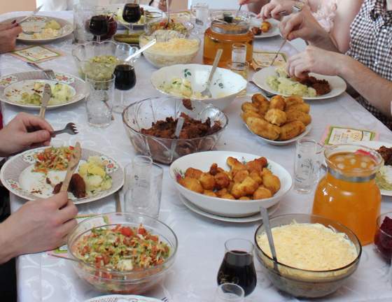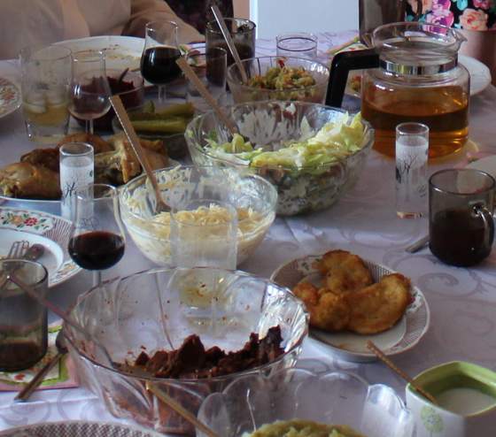 Menu główne tradycyjne: Rosół, ziemniaki, kuleczki ziemniaczane (smazone jak frytki z gotowanych ziemniaków), roladki z piersi serem i pieczarkami(tesciowa), karkowka z pieczarkami w sosie pomidorowym, salatka z selerem konserwowym, szynka, serem, schabowe, kurczak, gołąbki w sosie pomidorowym, sałatka z pomidorem, sałata, porem, młoda kapusta, gyros, przekąski (ogórki, buraczki) kompot, winko. Obiad przygotowania praca zbiorowa ja, tesciowa, i macocha