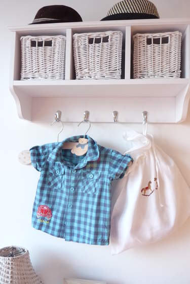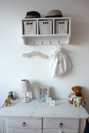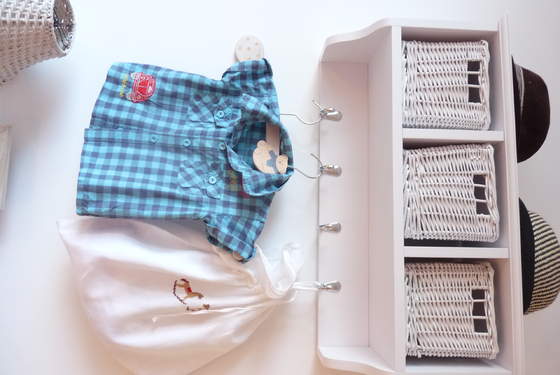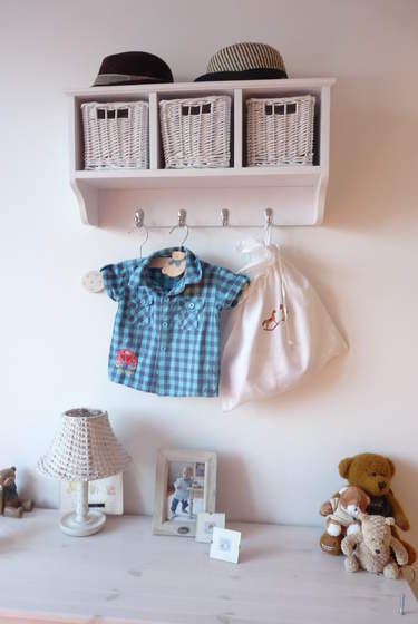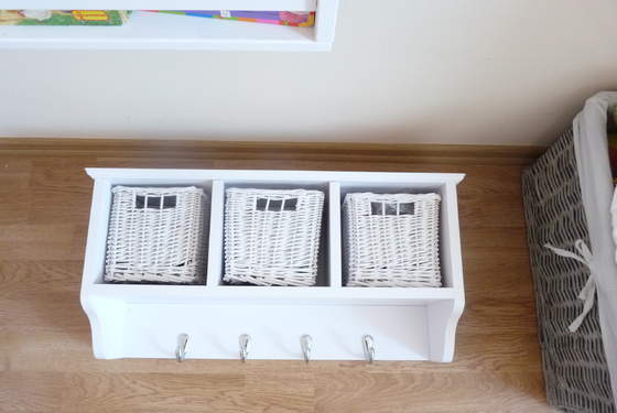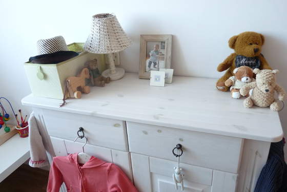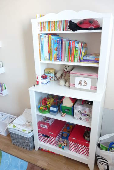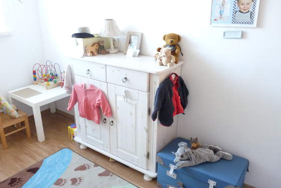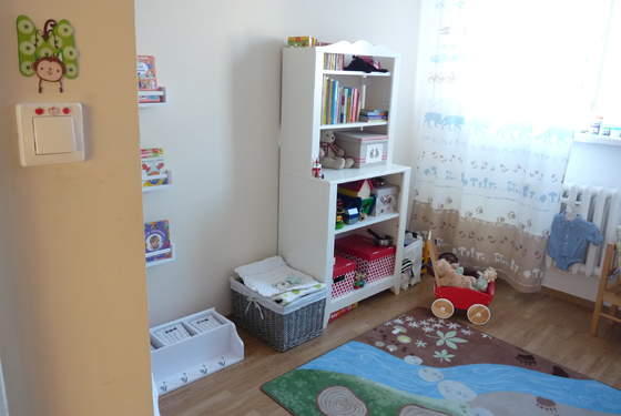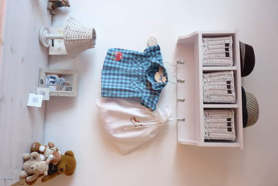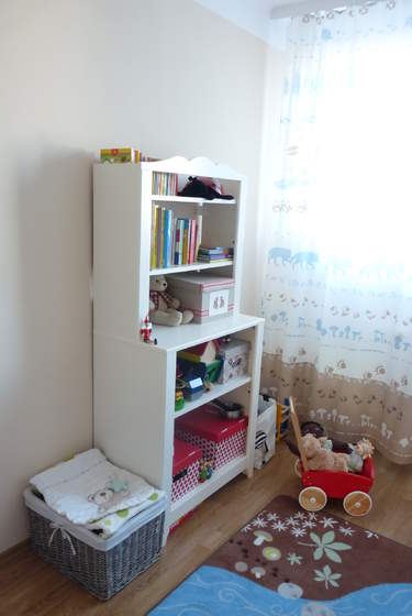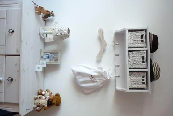 Pod skrzydłem biurka są dwie szyny które robią za drążek na ubranka, a większe zabawki są po prostu "na środku" , mniejsze w pudełku przy łóżku, część pod.