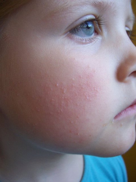 Moja córka od urodzenia miała problemy z krostkami na buźce. Początkowo miała zmiany jak na pierwszym zdjęciu i też się drapała, nie mogła spać była niespokojna. Byłam u wielu lekarzy i każdy gadał coś innego. Trądzik niemowlęcy, alergia, gronkowiec, potówki... Ile jak się nastresowałam ... Zniknęło samo... Po zniknięciu tych pierwszych zmian pojawiły się inne ( zdjęcie drugie) i pojawiają się do dzisiaj. Na czole, policzkach, brwiach. Czasem drapie czasem nie. Sama doszłam do tego, że jest to rogowacenie okołomieszkowe, a nie żadna alergia. Smaruje kremem nawilżającym i pomaga. Wydaje mi się, że jeśli byłaby to alergia bądź nietolerancja białka zmiany pojawiłyby się również na ciele, nie tylko na buźce.