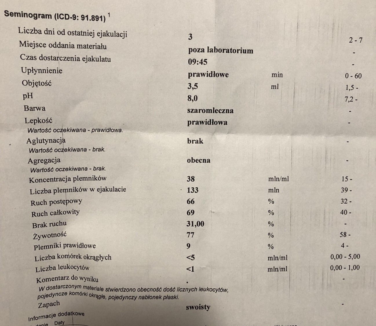 Te nieszczęsne leukocyty prześladują nas od lat,u Twojego tez pewnie jakis stan zapalny. Widziałam kiedys pod mikroskopem jak wyglada sperma z leukocytami i wcale sie nie dziwie ze żołnierzyki takie słabe jak z kazdej strony je leukocyty okrążają. Plemniki prawidlowe 9% u was, dla Nas to marzenie. Jednak Twojemu leukocyty jakoś szkód nie robią tak jak u Nas... I tak jest ze wszystkim, mimo ze dane podobne to i tak kazdy organizm sobie po swojemu żywot prowadziLaurka spójrz my mamy tylko coś takiego