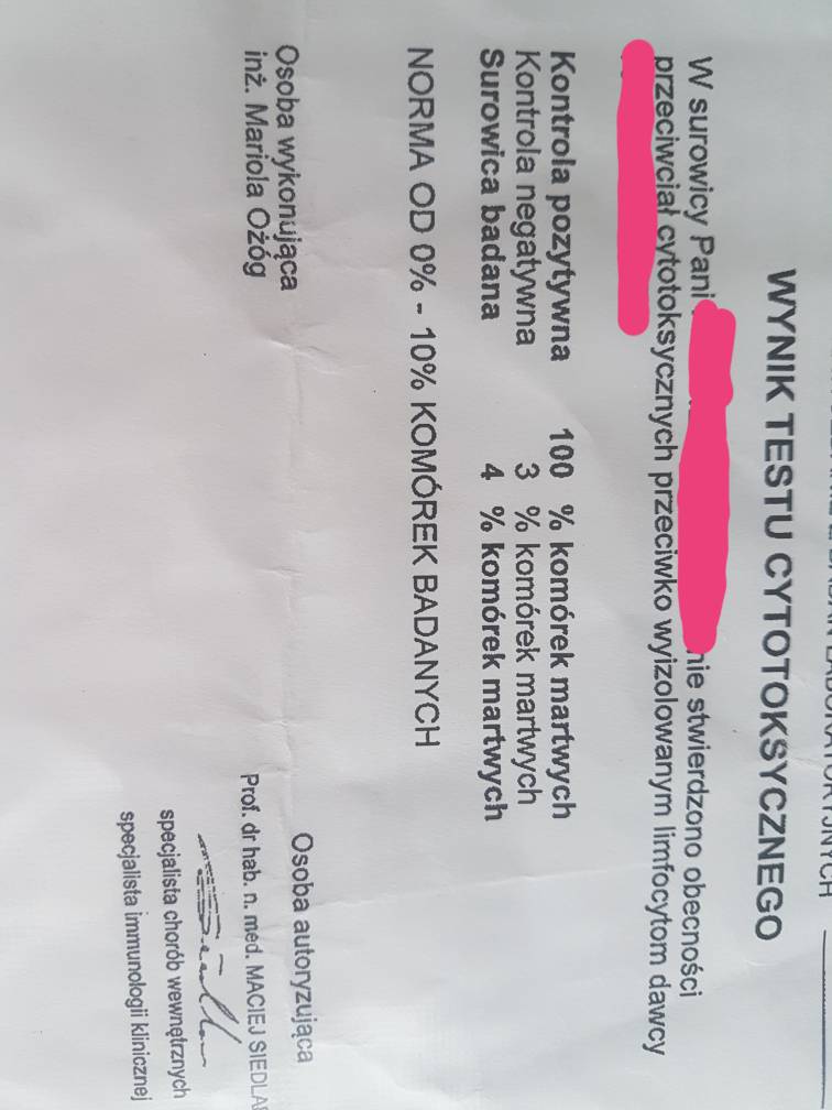 Tzn robilam jedno badanie gdzie mieszali cos z moja krwia i meza... i sie nazywa test cytotoksyczny. Wyniki tak wygladajaZobacz załącznik 1001300