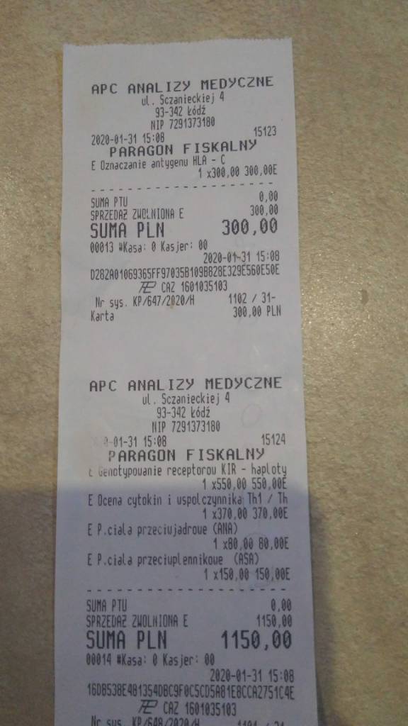 Wlasnie w gymcentrum robia zawsze kir dla kobiety i hla-c dla mezczyzny, chcialam zrobic jeszcze te imk bo reszte co ty masz na paragonie mam i tam jest u mnie ok - ceny takie same... Ale chyba jednak nie pojade bo dzisiejszych wiadomosciach ;(Do tego paragonu musisz doliczyć subpopulacje limfocytów, inaczej IMK za ok 450zl, musiałam ją zrobić pomiędzy 18-23 DC.