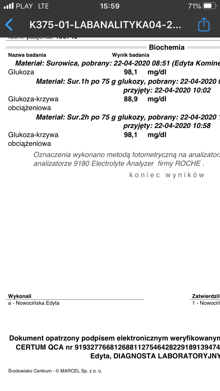 Według mnie leciutka insulioopornosc. Wyniki insuliny odbiegaja troche od normy ale pozniej ladnie spada - nie ma tragedii, pewnie diabetolog nawetmetforminy by nie przepisal ale ja przy takich wynikach pewnie bym ja brala zeby pomoc w implantacji. Troche diety i duzo ruchuDziewczyny mam pytanie co sądzicie o tych wynikach??? Proszę o pomoc