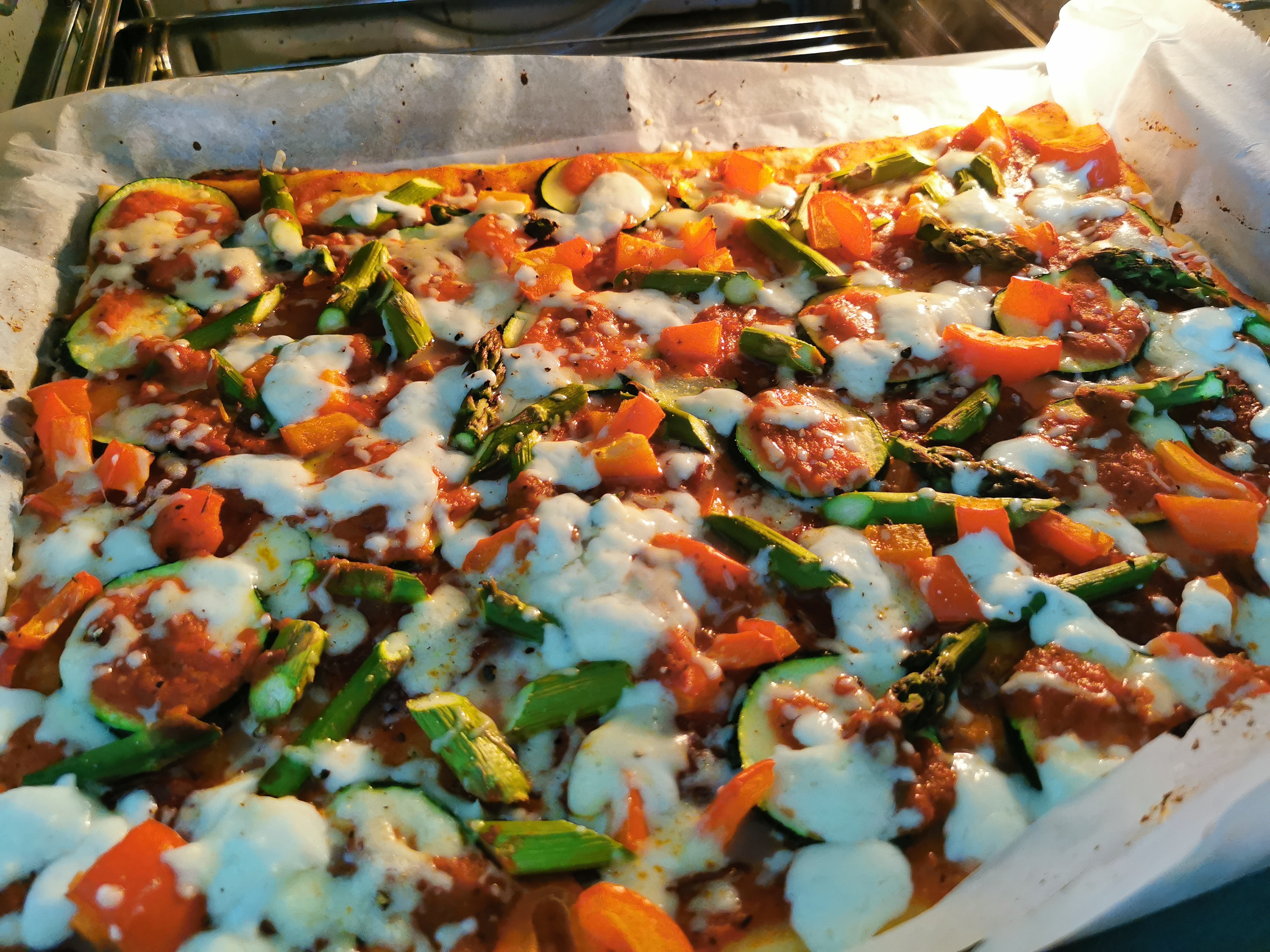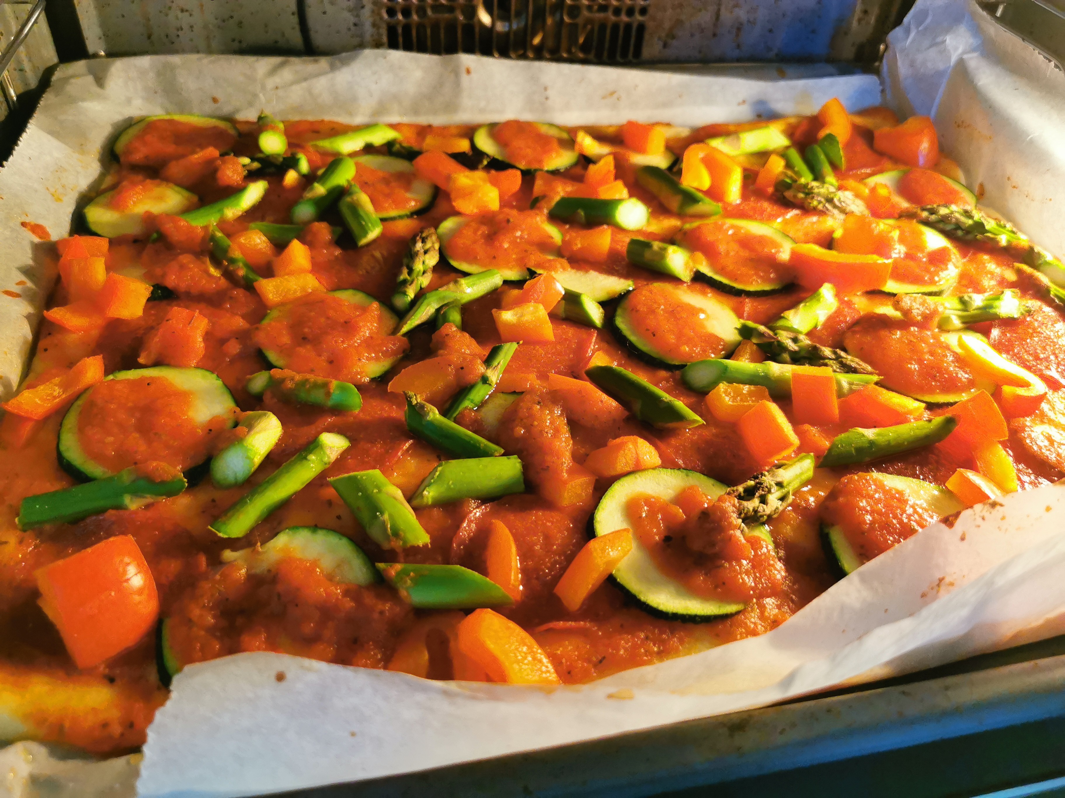 I salami i papryka i mozarella i ser żółty na wierzchu, ja już jestem głodnaAle wyczesana. Cukinia i szparagi? Ciekawy pomysł, jadłabym