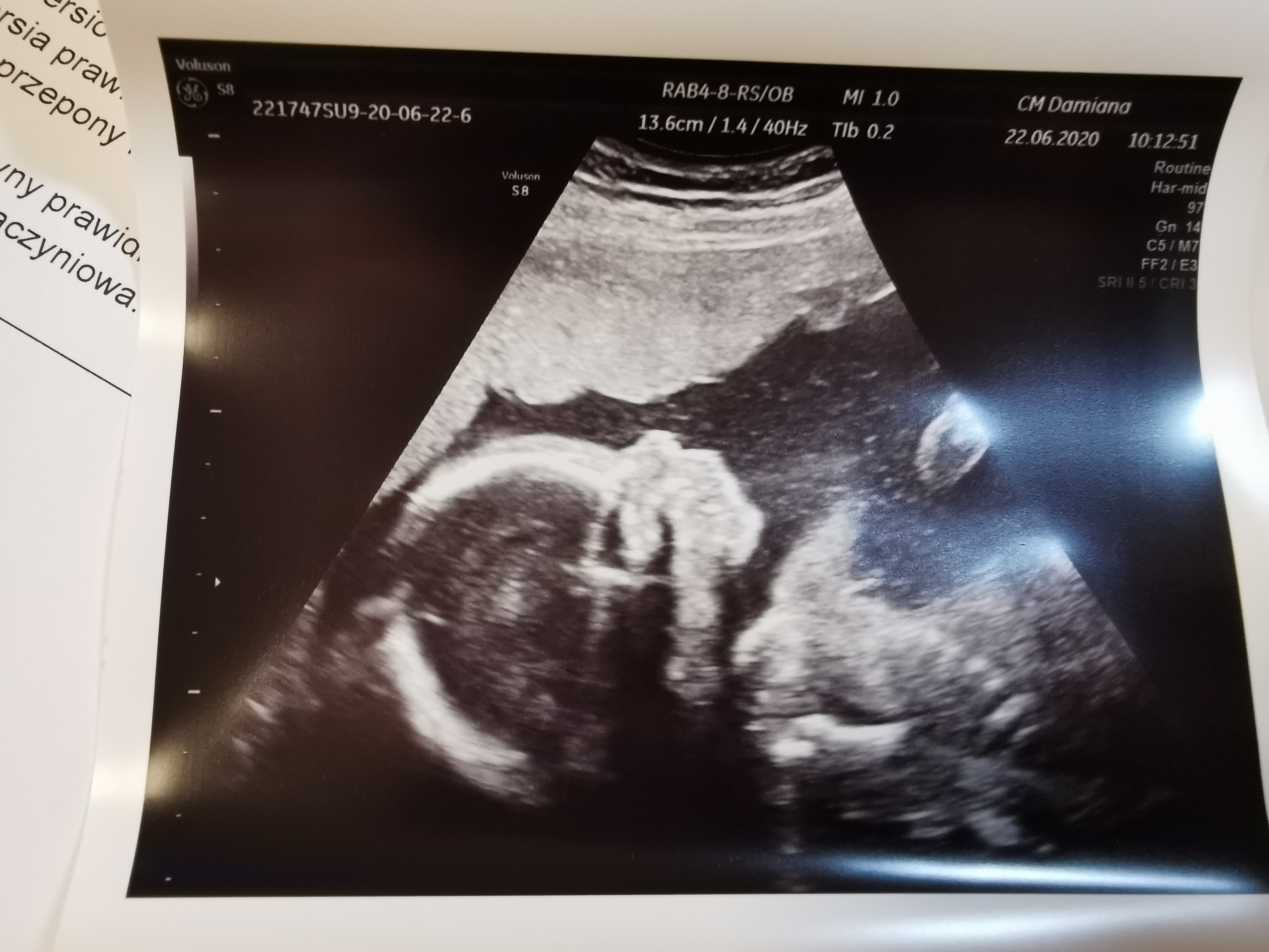 No i dzisiaj to tak "tu główka, a tu w przekroju, polozenie miednicowe, tu kość udowa, a tu nerki, a tu pecherz, a tu rączki, a widzi pani łokieć, a tu dłon i paluszki itd."