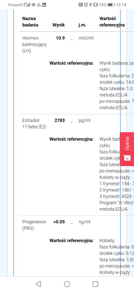 Tak biorę Estrofem 2x1 od 2dc. Wartość referencyjna: Wynik badania zależy od fazy cyklu:Jesteś w fazie folikularnej LH i Progesteron dobry co do Estradiolu to nie widzę widełek i pytanie czy już bierzesz np Estrofem bo to może zmienić wynik