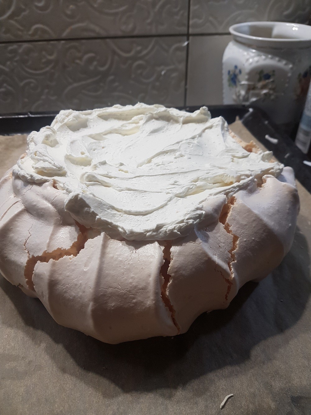 @Caro♤♤♤♤ jesli chcesz przepis to: 6 bialek - trzeba bardzo uwaac zeby nawet kropla zoltka ci sie nie wbila. NA jedno biłko 50 gr cukry jakiegos drobnego zeby sie lepiej rozpuszczal. I najwazniejsze bardzo popwolutku i stopniowo wsypywac cukier - mi calosc ubijnia zajela 20 minut. na koniec Łyzka skrobi ziemniaczanej i troche soku z cytryny i znowu chwile ubijasz. Na papierze odrysowalam sobie kołko i formowalam tak ze łyżką te brzego jakby do gory powlekalam i srodek zostawilam jak by taki zagłebiony. Piekwrnik termoobieg na15o stopni a jak ja wlożysz to od razu na 115 stopni zmniejszasz i tak sie piecze okolo 2h 15 minut. Pozniej wyłączasz piekarnik uchylasz drzwiczki i tak niech sobie posiedzi z 15 minut i uubijasz serek ze smietana - nie mialam czym udekorowac