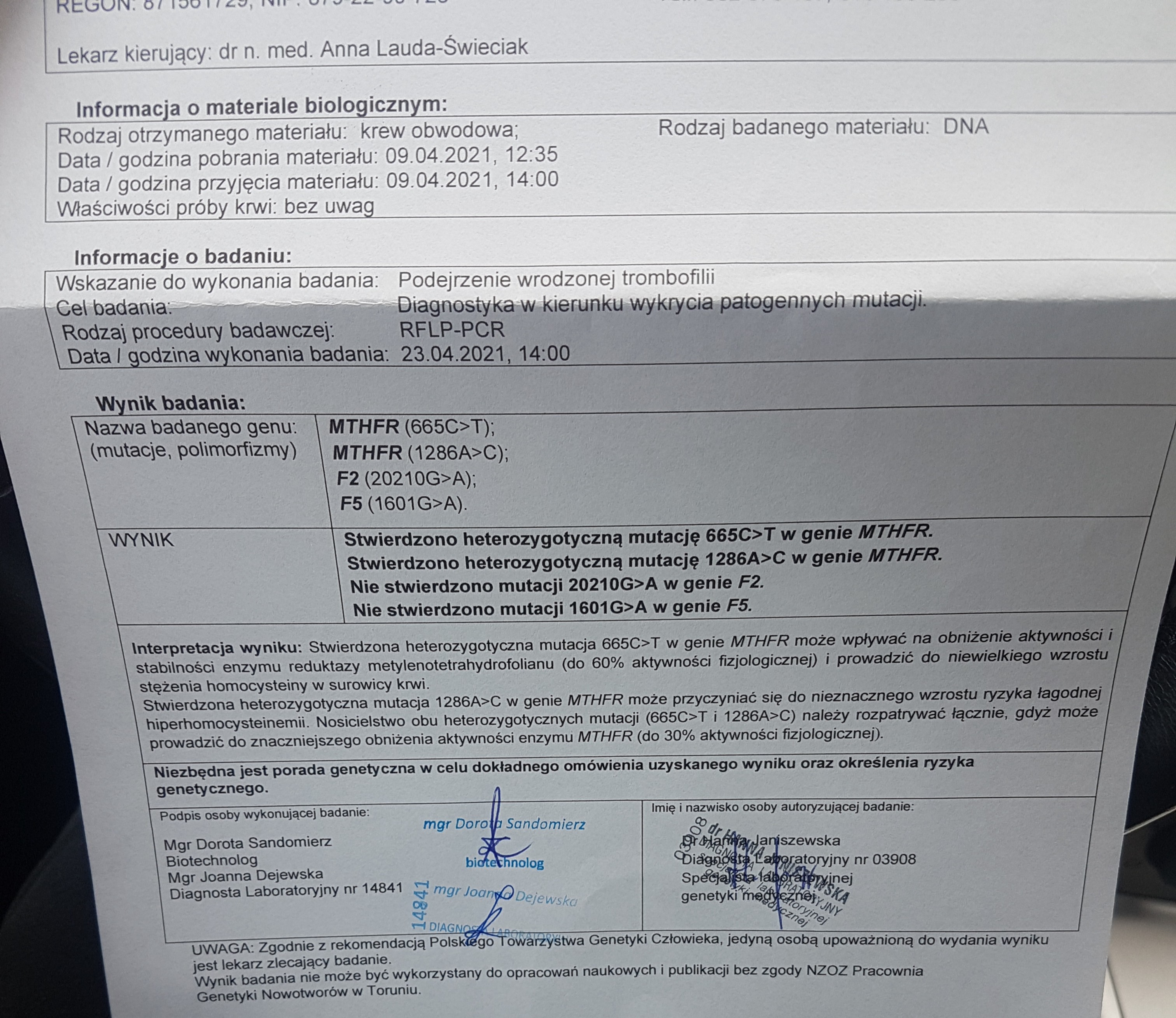 Mutacja MTHFR, laski proszę o interpretację bo sie stresuje mocno. Bylam po wyniki męża na wrodzony przerost nadnerczowo płciowy i nie ma go ani nie jest nosicielem!!!