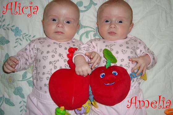 Iwee jeszcze raz gratuluje maluszki prześliczne i widzę że masz parkę tak jak ja. U mnie synuś urodził się mniejszy ale bardzo szybko przegonił córcie to on pierwszy zaczął się śmiać i gaworzyć wydaje mi się że to dlatego że on w wcześniej więcej płakał i chciał być przymnie więc więcej się do niego mówiło itd i może dlatego w każdym bądź razie współczuje kolek bo to naprawdę z tego co słyszałam męczące dla rodziców jak i maluszków moje na szczęście nie miały kolek pierwsze 2 miesiące to sprawdzałam w dzień czy żyją i budziłam je na jedzenie bo najchętniej cały dzień by przespały nauczyły się płakać dopiero po 1.5 miesiąca tak to budziły mnie takim cichym jękiem i tyle a w nocy dopiero budziły się same tak z 4 razy i jadły bardzo długo. Teraz mniej śpią więc jest ciężej ale powiem sczerze że do tej pory sobie z tego nie zdawałam sprawy ale on są chyba grzeczne Bartuś czasem tam więcej płacze ale niunia to prawdziwy aniołek wiadomo że czasem płacze ale ogólnie jest taka cichsza od synka. Powiem szczerze że czasem mam dość bo jestem z nimi prawie cały czas sama i tylko ja w nocy do nich wstaje bo mąż pracuje teraz po 10 godzin i jeszcze dorabia więc w sumie tylko w 1 tygodniu ich życia wstawał zemną do nich. Wiem że wstyd narzekać jak wy macie po więcej dzieci i dajecie rade to i ja dam. Pozdrawiam I CAŁUJE MALUSZKI. Moje szkrabiki kocham ponad życie i wstyd pomyśleć że jak dowiedziałam się że będzie dwoje się troszkę zmartwiłam jak sobie damy rade i wogule a teraz wiem ze największek sczeszciescie jakie mogło nas spotkać i wszystko warto dla nich pokonać.