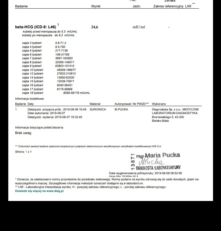 Ja się przywitam ale raczej nie nastawiam się zbyt na nic. W kwietniu poroniłam w 6 tygodniu samoistnie bez zabiegu. W lipcu znowu zobaczyłam dwie kreski w terminie @ a po południu tego samego dnia dostałam okres... Wkurzyłam się i zrobiłam w końcu badania hormonów w tym cyklu. Wszystko w normie poza TSH - 4,4. Przed wizytą u endokrynologa zrobiłam test dla pewności raczej się nie nastawiałam że znowu ujrzę dwie kreski .... Nie czułam się ciazowo... No i ujrzałam... Biorę od dwóch dni leki na tarczyce, byłam na Becie ale jeszcze nie mam wyników i jutro wizyta u gina. Boję się jak jasna cholera
