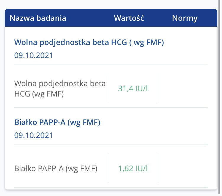 Na temat samej trisomii staram się zbyt wiele nie czytać, bo jak tylko cokolwiek zobaczyłam to mi się słabo zrobiło więc nie chcę się jeszcze bardziej stresować. Wyniki Pappy i hcg mam: